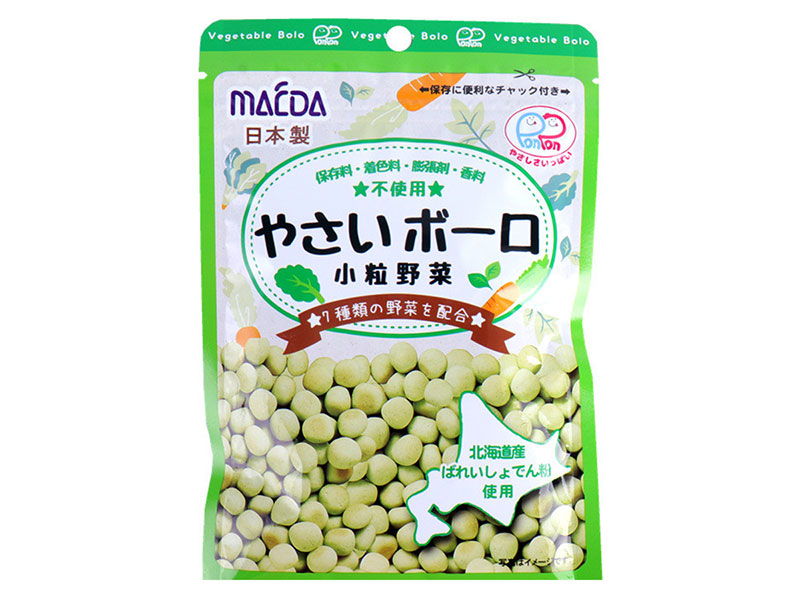 Thành Phần: Tinh bột khoai tây (Hokkaido) (65%), trứng (8%), đường, siro, bột Kanbai (tinh bột bắp, bột nếp), sữa bột tách béo, bột rau củ (1%) (cà rốt, cải bó xôi, rau mùi tây, rau cần Nhật, lá củ cải, cải xoăn, rau đay). Không cho trẻ ăn khi đang nằm hoặc đang cõng trẻ. Quan sát kỹ cho tới khi trẻ nhai hết.