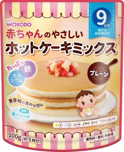 Bột Làm Bánh Pancake Wakodo được sản xuất riêng với hàm lượng an toàn cho phép đối với trẻ 9 tháng trở lên gồm thành phần chính từ trứng, sữa, lúa mì, đậu phộng, tôm, cua biển, rau bina, bí đỏ & khoai lang...
