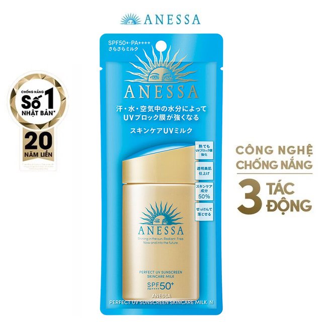 Anessa Perfect UV Sunscreen Skincare Milk N SPF50+ PA++++ ứng dụng công nghệ Auto Booster và Very Water Resistant độc quyền từ thương hiệu ANESSA, giúp cho lớp màng chống UV trở nên bền vững hơn khi gặp NHIỆT ĐỘ CAO - ĐỘ ẨM - MỒ HÔI - NƯỚC - MA SÁT, đồng thời chống trôi trong nước lên đến 80 phút, chống bụi mịn PM.25 và chống dính cát. Ngoài ra, sự bổ sung của phức hợp 50% thành phần dưỡng da giúp ngăn ngừa lão hoá do tia UV hiệu quả và nuôi dưỡng da ẩm mịn.